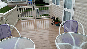 Welcome to the Balmoral on Manor Park Holiday Village, Hunstanton, where she and her decking area are situated on a perfect pitch for the sun all day, and in those cooler months she has full gas central heating and double glazing. This caravan is a spacious and comfortable holiday home and has a large family lounge with a pull out sofa bed to accommodate 2 people, and is 6 berth in total. The lounge also has a pull out single bed for if 5 guests are staying too. There is room for a travel cot, and there are two large dog cushions with washable covers that may seat two small dogs or two large. The caravan has a good sized decking area outside with a gate that locks - with a key kept high on the kitchen wall, and the decking can be overseen from the kitchen and living room windows, which is perfect for keeping children and dogs safe, and security of mind through observation when not on the decking yourself. I would suggest that one enters by the second separate hall door near the patio area, hence keeping the decking area locked for security. There are two outdoor tables with chairs and loungers for the decking area. There is a 29" television, DVD player, and electric fire in the lounge, and soft lighting for relaxing evenings if you decide to stay in. In January 2017, upholstery and foam in furniture were upgraded for comfort. The main bedroom is a comfortable size and has a double bed, dressing table and a good sized double wardrobe. All mattressess and pillows have protective covers regularly washed. The twin bedroom has two #full size# single beds with a wardrobe and wall storage above beds. The 1st bedroom wardrobe holds pillows, quilts and bed linen for the lounge pull out beds. There is a dog bed under the double bed with regularly washed covers. All windows to the caravan have custom made curtains that are blackout for lazy mornings if required, and thermal for winter evenings, with bright white voiles for guest's privacy. The bed linen, electric and gas usage is included in the advertised price. The kitchen area is open plan from the dining area and living room, and is fully equipped with the crockery and utensils needed for your holiday. There is a gas oven and hob, a microwave, fridge freezer, and all the usual electrical appliances found in a kitchen. On arrival you will find fresh milk in the fridge, coffee and tea bags for refreshment while unpacking, and if you have a dog, there are 3 bowls, one of which will hold fresh water on the decking for the afternoon you arrive. The local Tesco Supermarket is a two minute drive from the caravan to collect your groceries, or the Sainbury-Supermarket is in central town, and this year competition is being built on the main road into Hunstanton; Lidl. The unusual 'Very' large bathroom in Balmoral 22 comprises of a toilet, a wash basin, a separate shower unit to one side and a full size bath with good grip handles to the other side. This is a convenient feature for a disabled person or elderly person, however there are steps to the exterior decking area that may have to be taken into consideration.There is also a separate small room with toilet and hand-basin for family convenience. There are two cupboards in both toilet areas, which hide the cleaning equipment. You will find hand towels, but you will need to bring large towels for the beach, swimming pools and bathroom. Also, please remember to bring plenty of doggy towels to wipe him/her down after a bath from the beach.