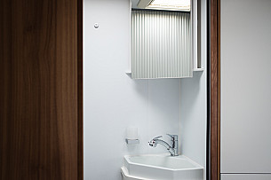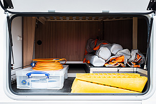 The bathroom is well equipped with sink/shower-head and toilet. An incredible amount of storage throughout the motorhome with a rear under-bed storage area too for all your 'stuff' and a bike rack for four bikes on the rear of the motorhome too.