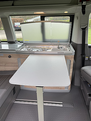 This camper is a 2022 California Coast (Euro6), an automatic, with 2 isofix fixings, full camping interior, a 2 ring gas hob, on board running cold water, sleeping for a family of 4 (2 adults, 2 children) or 3 adults. This camper has a diesel night heater or electric heater if you have hook up, a wind out awning/canopy, it also has 2 chairs and a freestanding table stowed away neatly, giving more living room. The front 2 cab chairs swivel to make a cosy area for all 4 people to eat and relax and USB charging points. There are 4 beds, a double lower rock and roll bed and a double upper bed in the pop top (suitable for 2 children or 1 adult). Euro 6 means you can travel through clean air zones without incurring charges.